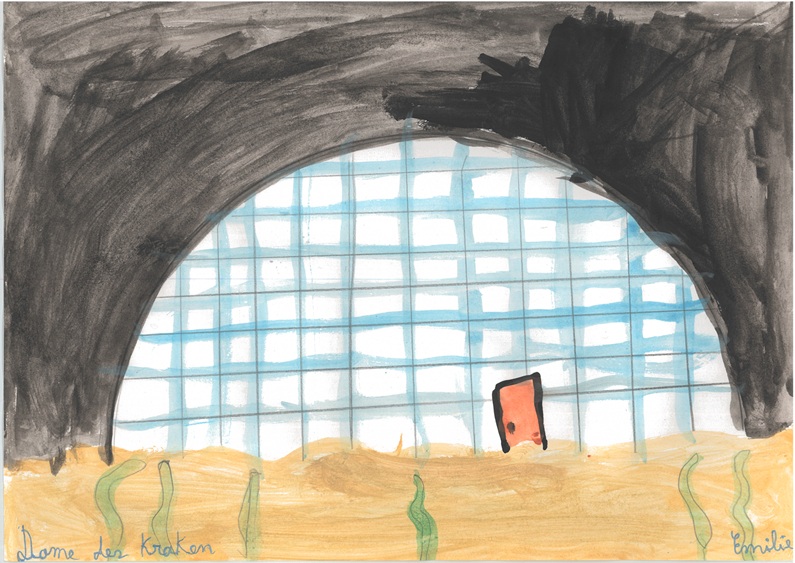 Guimauve, qui a pris l'habitude des escaliers depuis sa cascade dans la grande salle de l'iceberg musical s'emmêle les pattes et tombe, mais plus doucement car l'intérieur du dôme est entièrement sous l'eau. Le Kraken géant le regarde sans comprendre, car il n'a pas de pattes mais se souvient qu'il a oublié quelque chose !